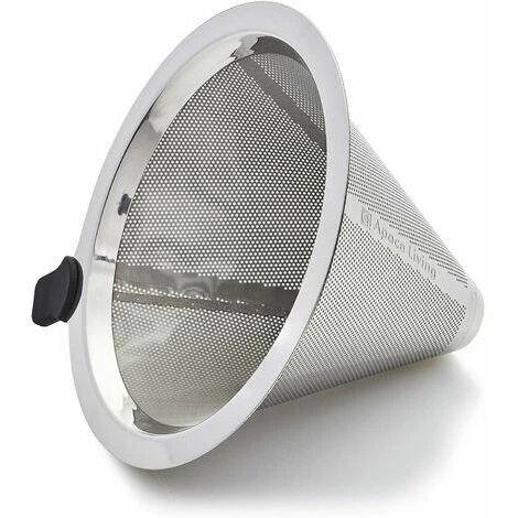 The V-shaped stainless steel filter is a double-layered fine filter, which allows the coffee to be filtered gently without using any filter paper. The filter has a handle for easy handling and placement.