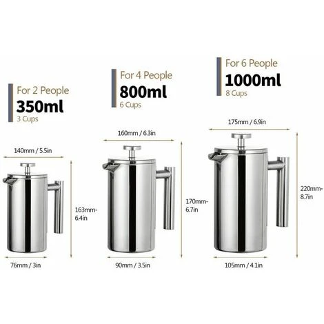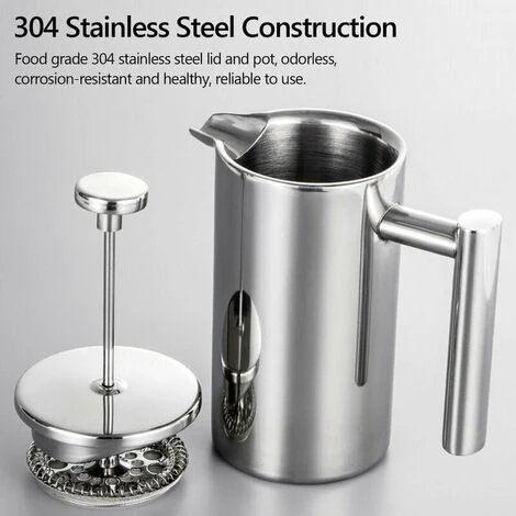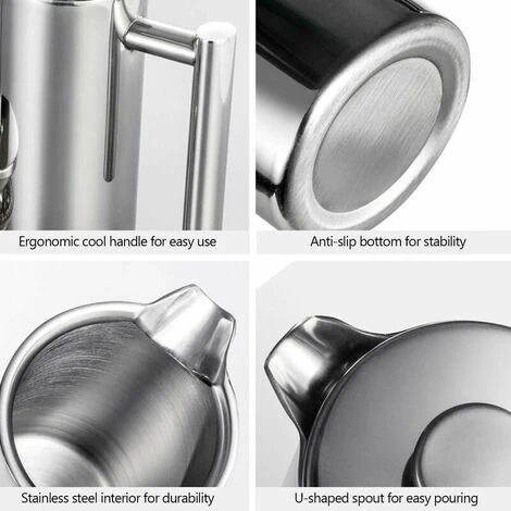 Made of 304 stainless steel, rust-proof, odorless and healthy. Double wall insulation keeps coffee hot for 1 hour. The fine mesh filter produces exceptional flavors. The ergonomic handle stays cool and won’t burn your hands. U-shaped spout allows for easy pouring to reduce spills and drips. The perfect choice for home and office. />