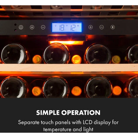 Klarstein Vinovilla Built Under Wine Cooler, Dual Zone Bar Fridge, Wine Coolers for Wine Bottles, LEDs, Touch Control, 5-20°C Range, 129 Litres, 43 BottlesTaking wine out of the restaurant and into the home, this 43 bottle drinks fridge allows you to build and store an exquisite collection of wine. Wine fridges are specifically built to protect a priceless collection from damage caused by incorrect storage temperatures, humidity, light, vibrations or poor air quality. This wine fridge neatly fits into any home, tasting room, kitchen or indoor/outdoor bar area, giving quick access to your best wines chilled at their ideal temperature. White, Red and Rosé Wine StorageWhether you drink it for pleasure, health or to complement a rich meal, there’s a lot to love about wine. No matter your preference, this dual zone mini fridge gives you full control of the storage climate. The bottom zone can be set from 12-20°C so it’s ideal for reds, while the top zone is a colder 5-12°C for prosecco, white and rosé wine, chilling them for when it’s time to uncork and serve.Elegant Design, Intuitive OperationAs much as we love the “rack ’em and stack ’em” approach to wine collecting, it’s not suitable for those who live in humid environments, nor is it a truly elegant way to store a collection of vintages. This wine cooler fridge lets you control the environment for longevity while displaying your high-end wine collection in a refined, beautiful manner. The wine and beer cooler is made with a stainless steel onyx frame and uses double-walled panoramic glass to give a constant view of your collection. This drinks cooler is controlled with a touch-sensitive panel that lets you set the temperature or select one of three premium LEDs to stage your wine under a soft glow that produces no heat. Product FeaturesDual zone onyx wine fridge fits 43 bottlesVibration free storageFour removable wooden shelvesLCD screen displays temperatureDimensions: 59.5 x 60 x 82 cm