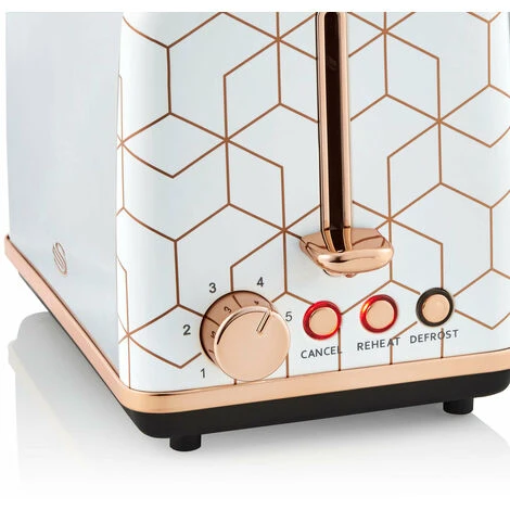 This Swan Tribeca 2-slice toaster provides both stylish design and optimal user performance. A streamlined modern interface and great functionality make this toaster the ultimate kitchen essential. Toast to your exact preference thanks to the six browning settings. Cancel, reheat and defrost functions allow for added versatility too. To prevent any mess, the Swan Tribeca toaster has cord storage and a removable crumb tray to catch crumbs which you can easily empty without hassle after use. Slices of bread come in all shapes and sizes this toaster has variable width slots. Due to its revolutionary auto-centring technology, you can rely on an even heat distribution, that browns to perfection. Crafted with white casing and rose gold geometric line work, this Swan Tribeca Toaster compliments all types of high-end décor, inspired by glamourous New York City aesthetic.
