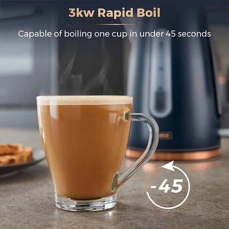 The Tower Cavaletto midnight blue jug kettle has a matte midnight blue finish featuring rose gold accents adding style to your kitchen and fits in with the coordinating Cavaletto range (sold seperately). A large viewing window on the side of the kettle allows you to easily monitor how much water is left so you know when it is time to refill.